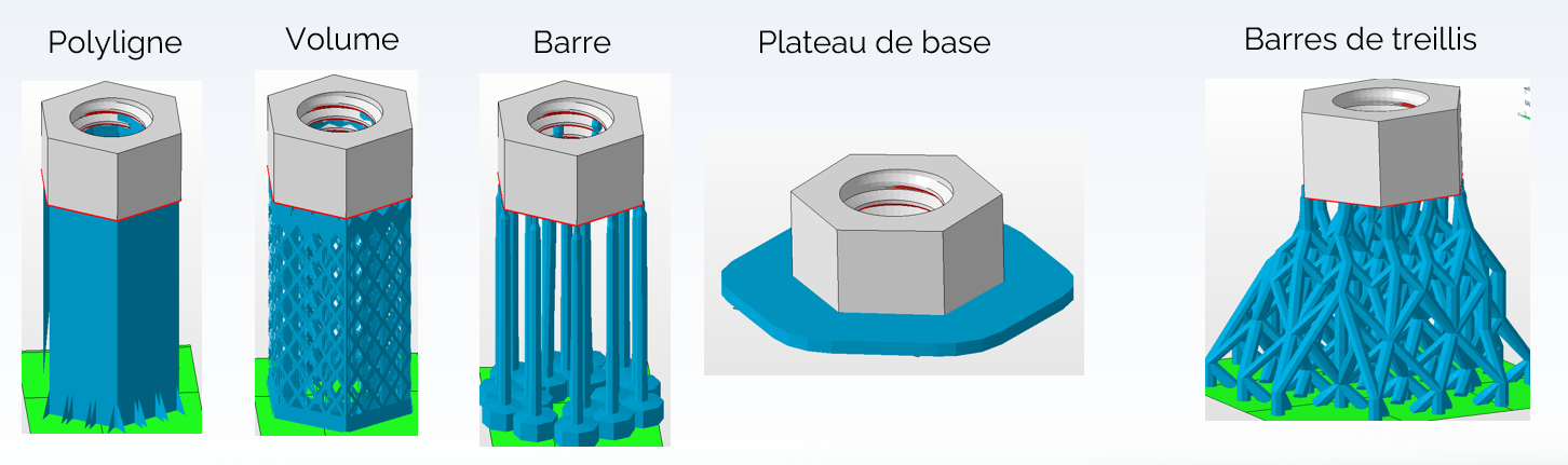 Netfabb offre la possibilité de générer les supports de sa pièce en un clic via différents scripts prédéfinis. L’image ci-dessous montre les possibilités de support en génération automatique :