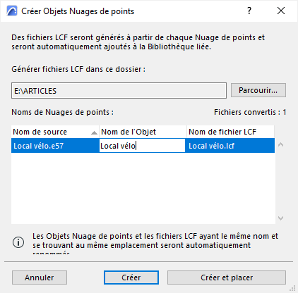 Dans Archicad, le nuage devient un objet .gsm, stocké dans un fichier .lcf (Conteneur Bibliothèque). On le retrouve donc dans l’arborescence des bibliothèques liées du projet.
