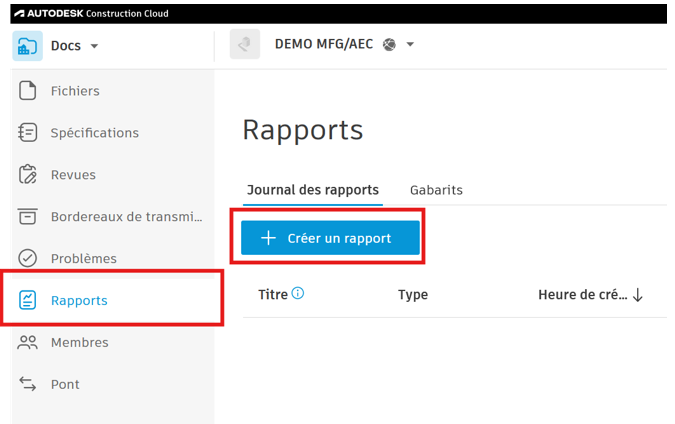 - Depuis l’interface principale d’ACC, cliquez sur « Rapports » dans le volet de navigation à gauche pour ouvrir l’outil dédié.