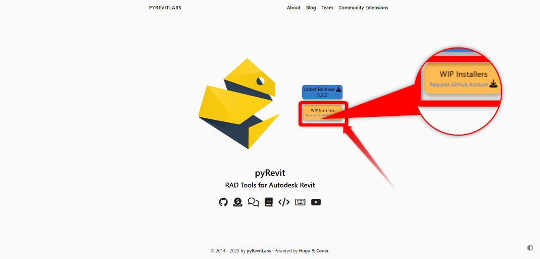 Rendez-vous sur www.pyrevitlabs.io. La version stable ne supporte pas encore Revit 2025, mais dans la section “WIP Installers” (Work In Progress), vous trouverez une version en avant-première compatible.