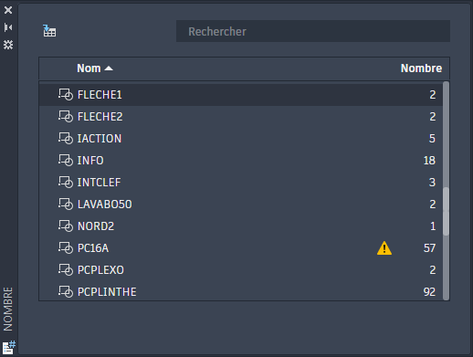 On peut aussi sélectionner un bloc dans le dessin, et depuis le menu contextuel choisir Compter la Sélection, cela afficher le résultat dans la palette Quantité.