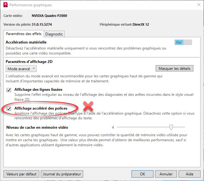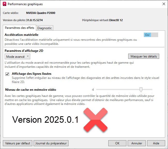 La commande CONFIG3D (CONFIGGRAPHIQUE) permet de modifier certaines options en fonction de la carte graphique et du contenu du DWG.