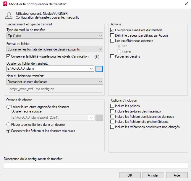 - Dossier du fichier de transfert : l'emplacement par défaut du .ZIP obtenu est le dossier du dessin ouvert.
