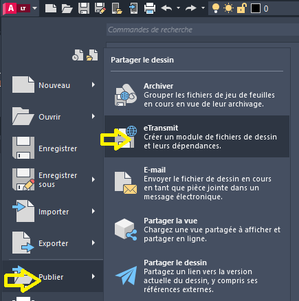 La fonction e-Transmit permet de créer un fichier .ZIP contenant tous les fichiers xref et tout ce qu'AutoCAD a besoin pour afficher le dessin , voyons cela :
