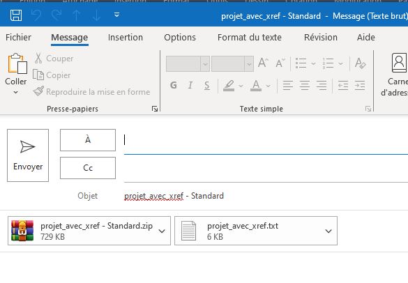 Ouvre la messagerie avec un nouvel email, et ajoute en pièce jointe le fichier .ZIP créé par eTransmit et le rapport au format TXT qui indique les noms des dessins.