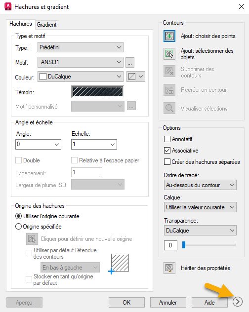 -1- Démarrez la commande hachures, puis accédez aux options :