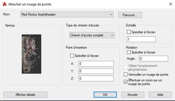 Depuis le ruban, onglet Insertion et la commande ATTACHER et choisir un fichier de nuage de points : .RCS (ou type .rcp) fichiers RCP et RCS
