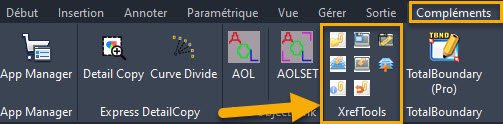 Démarrez AutoCAD : on retrouve le groupe d’icone : XrefTools dans l’onglet Complément