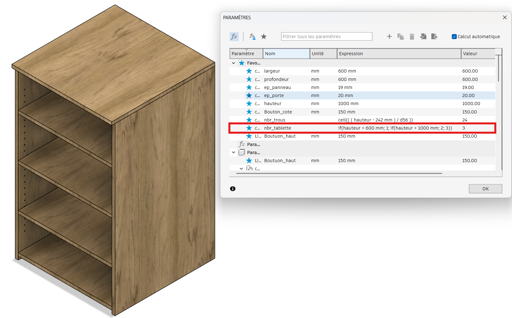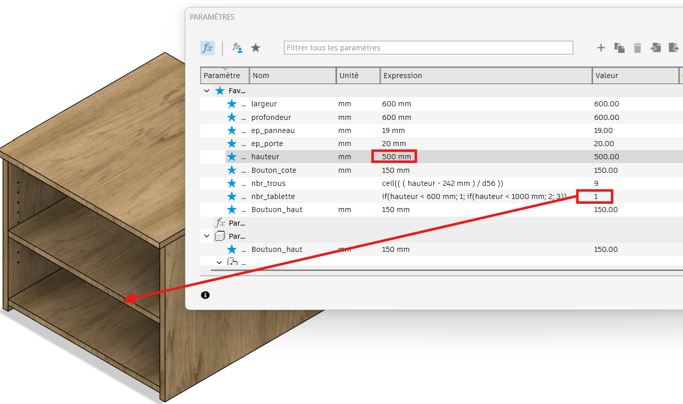 Dans l'exemple ci-dessous, nous voulons gérer le nombre de tablettes d'un caisson en fonction de sa hauteur: