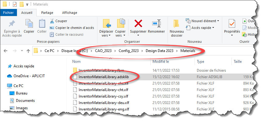 La configuration de cette bibliothèque est gérée de la même façon que celle fournie par Autodesk et qui se nomme InventorMaterialLibrary.adsklib.