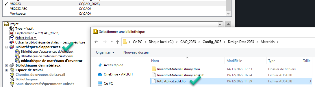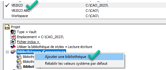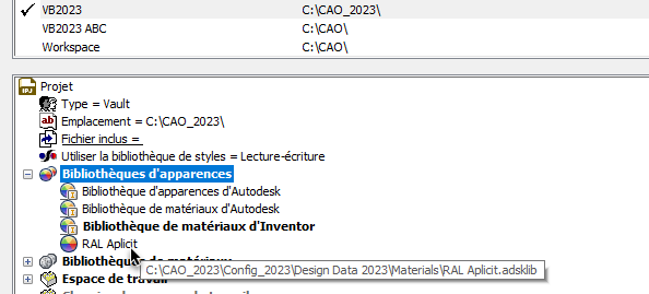 Pour solliciter cette bibliothèque dans votre session Inventor il faut aussi l'ajouter au projet actif.