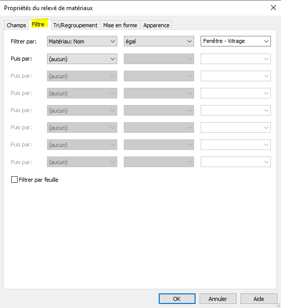 Dans cet exemple nous n'avons qu'un seul type de matériau de vitrage, mais il est bien sûr possible de filtrer par type de matériaux ; Si vous avez plusieurs type de vitrages différents par exemple.