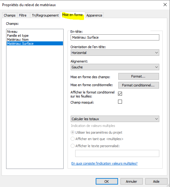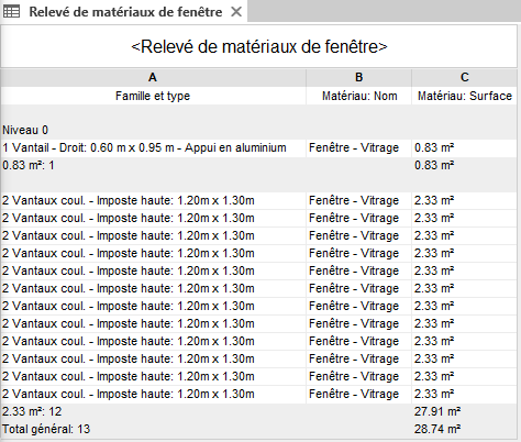 Il est fortement conseillé de calculer les totaux pour voir la surface totale des matériaux de vitrage dans le projet