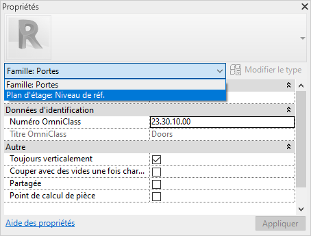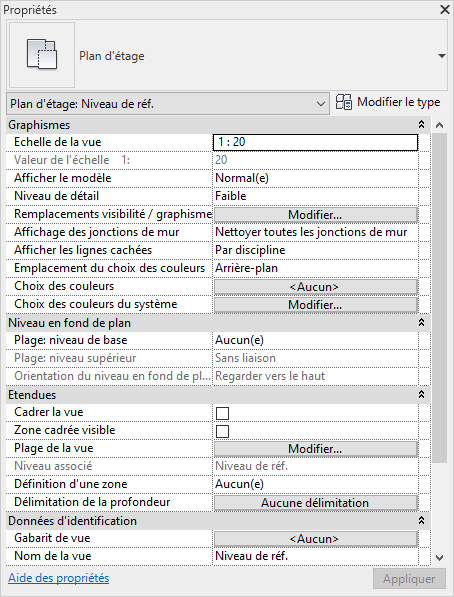 Pour accéder aux propriétés de la vue, cliquer sur la flèche à côté de la catégorie et sélectionner : Plan d’étage : Niveau de réf.