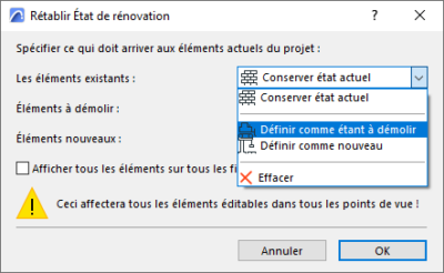 Les réglages par défaut permettent de supprimer les éléments démolis et de passer le projet en existant sans même avoir à faire un clic.