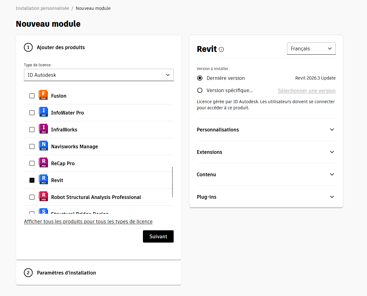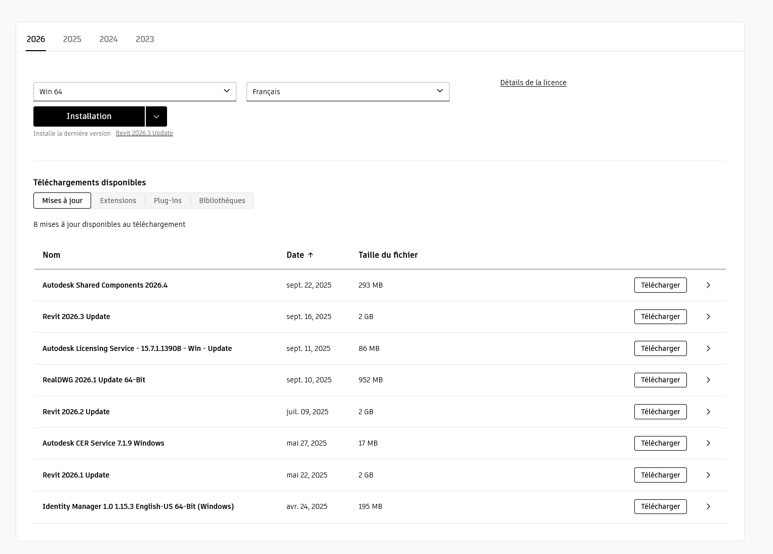 Ici vous pourrez choisir de télécharger mise à jour qu'il est conseillé d'installer, des extensions et plugi-ins pour des connexion avec d'autres produits (ACC, Robot,...) et la bibliothèque qui n'est plus installée automatiquement depuis Revit 2023.