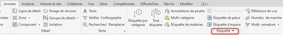 A noter que l’outil Etiquette par catégorie ne fonctionne pas pour les Pièces et les Espaces car il existe un outil spécifique pour chacune de ces catégories, qui se trouvent à côté dans le ruban.