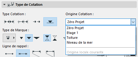 La valeur de la cote est calculée en fonction de l’origine de la cotation choisie : soit un des niveaux du projet, soit le niveau de la mer.