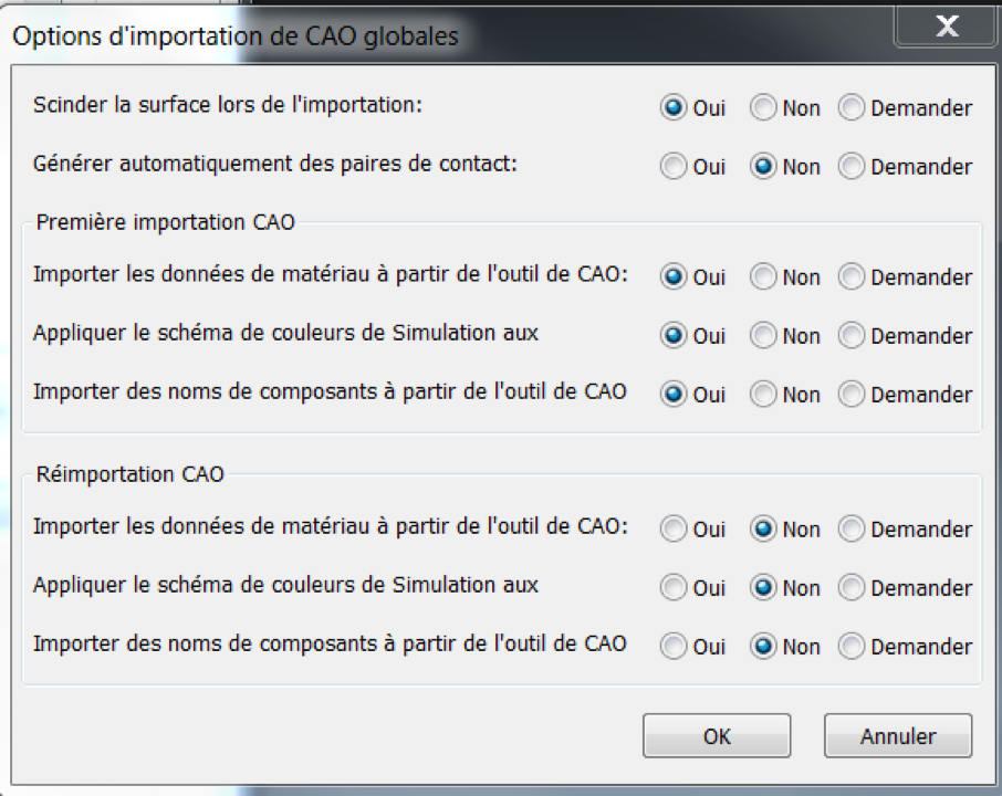 Ce menu permet donc de définir différentes options pour décrire au mieux les géométries importées, et surtout leur traitement effectif dans Autodesk Simulation Mechanical.