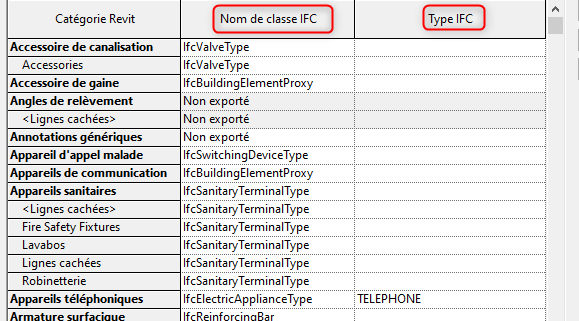 Propriété revit par défaut : Paramètre intégré de Revit utilisé par défaut à l'exportation. Si le champs est grisé, il n'y a pas d'exportation prévue de base par Revit.