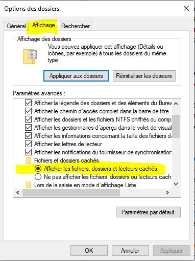 Puis onglet Affichage : cochez : Afficher les fichiers, dossiers et lecteurs cachés.