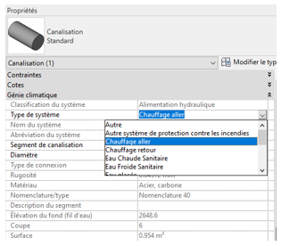 Lors de la modélisation d’une canalisation, il est possible de choisir le « type de système », celui-ci définira le système du réseau de canalisation (Exemple : Chauffage Aller, Eau froide sanitaire, Eau pluvial, etc…)