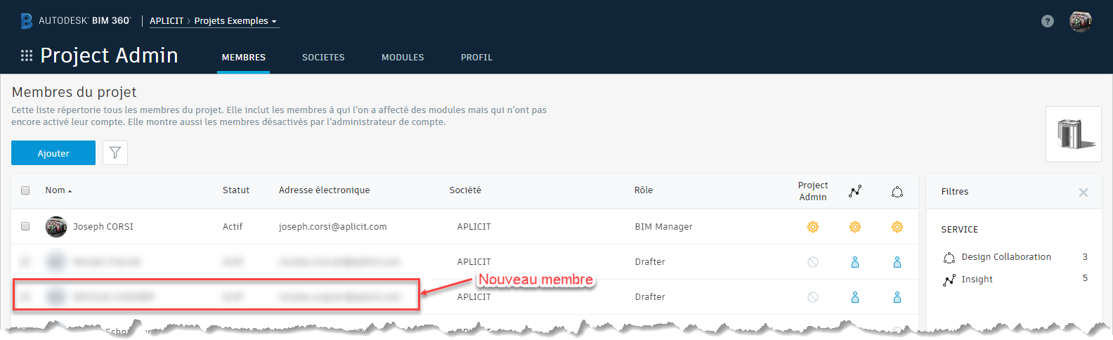 Tant que le membre n'a pas validé son accès, son statut inactif dans BIM 360
