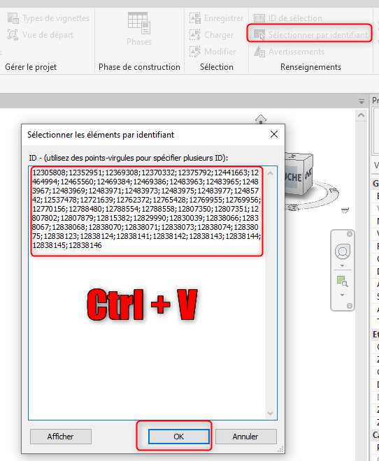 Puis dans Revit dans l'onglet "Gérer", cliquer sur "Sélectionner par identifiant" puis coller et enfin "OK"