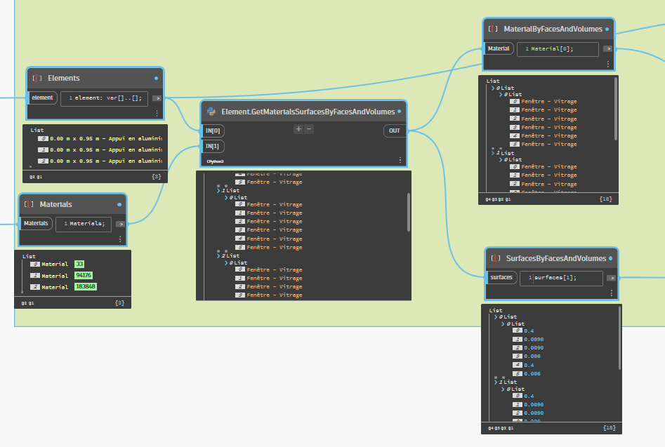 Le noeud ci-dessous nous permet, par élément listé, d'obtenir les surfaces de matériau classées par volume. De plus, seuls les matériaux en entrée sont considérés.