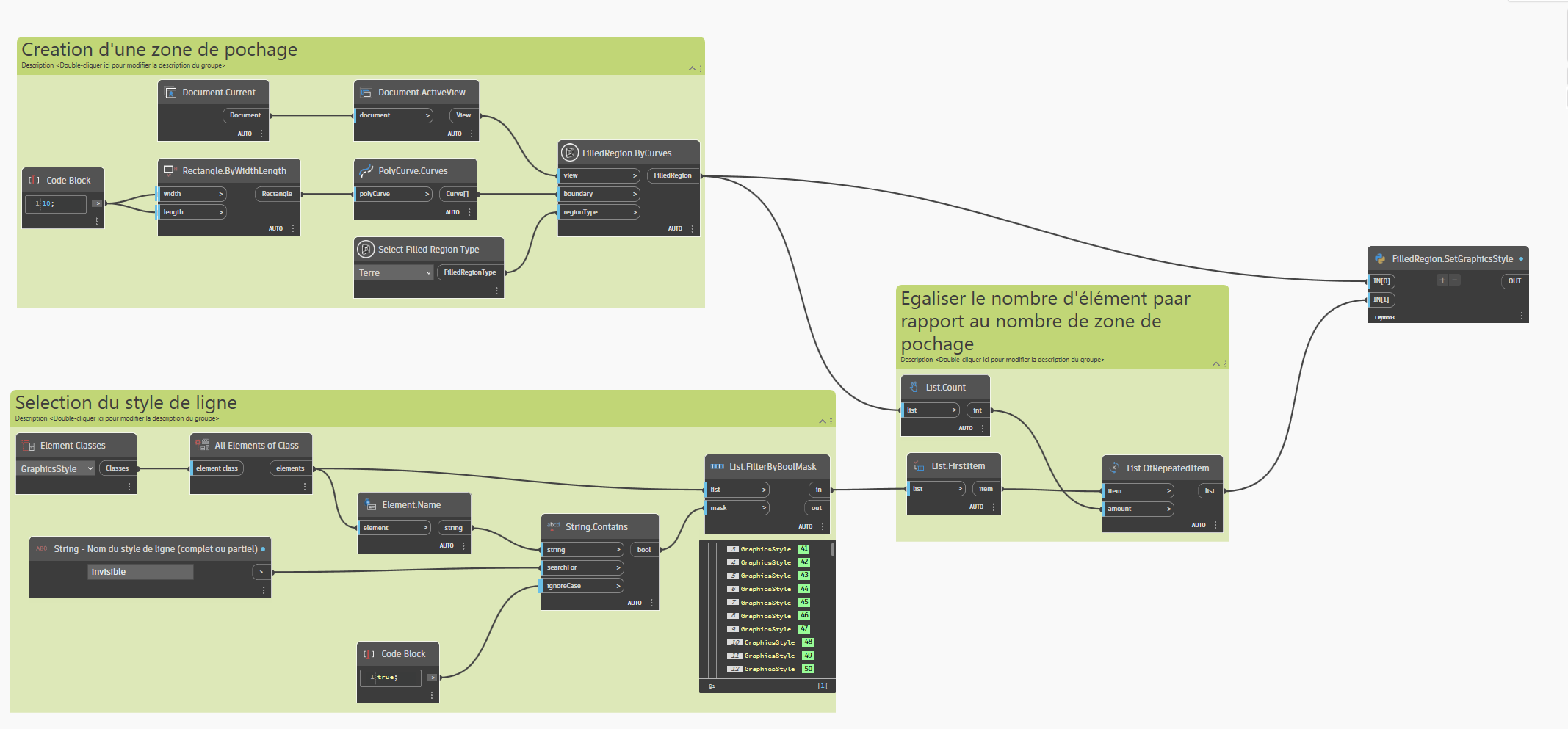 Il existe un nœud Dynamo qui permet de créer des zones de pochage (ou zones remplies) "FilledRegion.ByCurves". Cependant, celui-ci ne permet de gérer le style des lignes de contour.