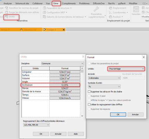 1) Paramétrez l'inclinaison selon l'unité voulue (Gérer -> Unité) (dans cette exemple en pourcentage)