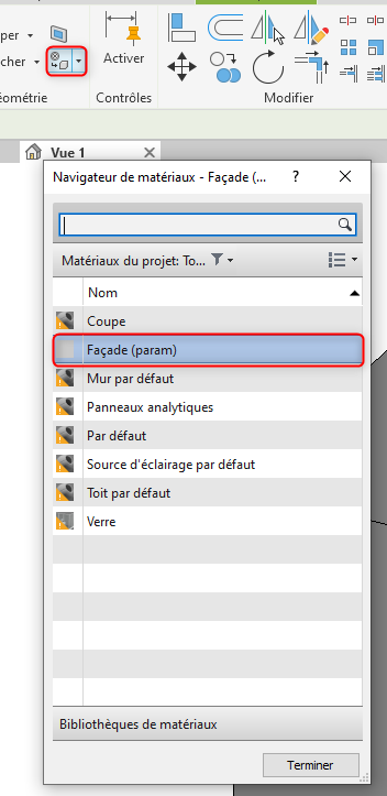 - Cliquer sur l'outil "Peindre" dans l'onglet "Modifier" et associer le paramètre matériau en le sélectionnant dans la liste des matériaux