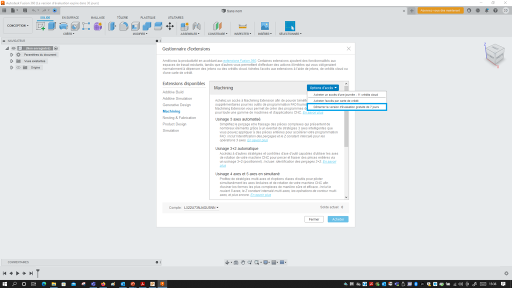 Fusion 360: où trouver les extensions disponibles et comment activer un essai de 7 Jours ?