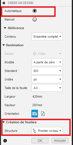 Cette option permet de créer tous les plans des composants d'un ensemble ainsi que la cotation associée.