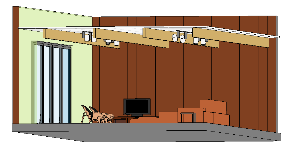 Permet de voir le sol, les murs et le mobilier. Ici, le niveau de base est le Level 0 La lecture du fond de plan (Regarder vers le haut) permet de voir le plafond et les poutres |
