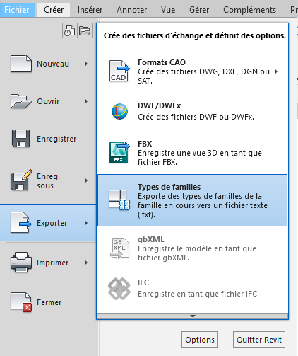 * Dans le fichier .rfa > Onglet FICHIER > Exporter > Type de familles > Cela créé un fichier .txt