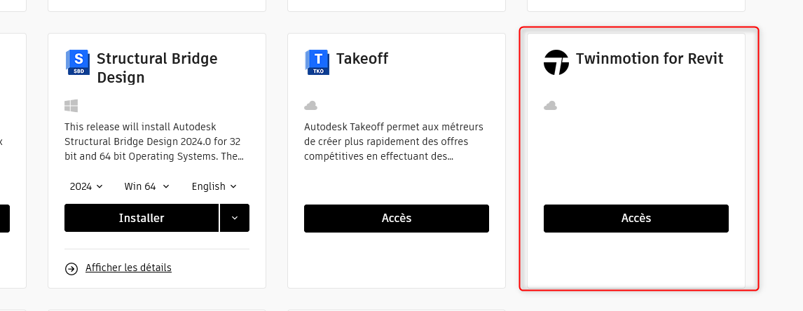 Pour installer Twinmotion il faut aller chercher "Twinmotion for Revit" sur votre compte AutoDesk (manage.autodesk.com) et non pas sur le site de l'éditeur Twinmotion.