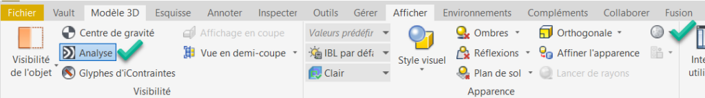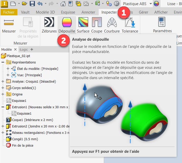Dans Inventor, cette fonction (disponible dans onglet INSPECTER (1)), évalue l’angle des faces par rapport à une direction de démoulage choisie. Elle montre si les surfaces présentent une dépouille suffisante, insuffisante ou inverse. En pratique, l’utilisateur définit un axe de référence, puis Inventor colore le modèle pour rendre les zones critiques immédiatement visibles.