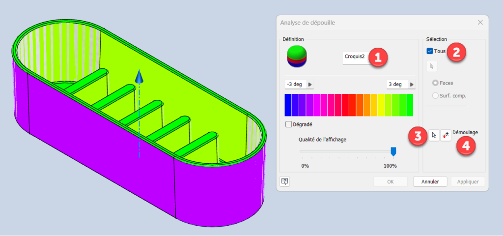 Pour obtenir un résultat fiable, il faut d’abord choisir une direction de démoulage cohérente avec le procédé réel (3) et (4). Ensuite, il faut interpréter les couleurs avec prudence, car le résultat dépend de l’orientation retenue. Enfin, il faut corriger la géométrie si des zones insuffisantes apparaissent, par exemple en modifiant un angle, en déplaçant une paroi ou en ajoutant une dépouille sur une extrusion.