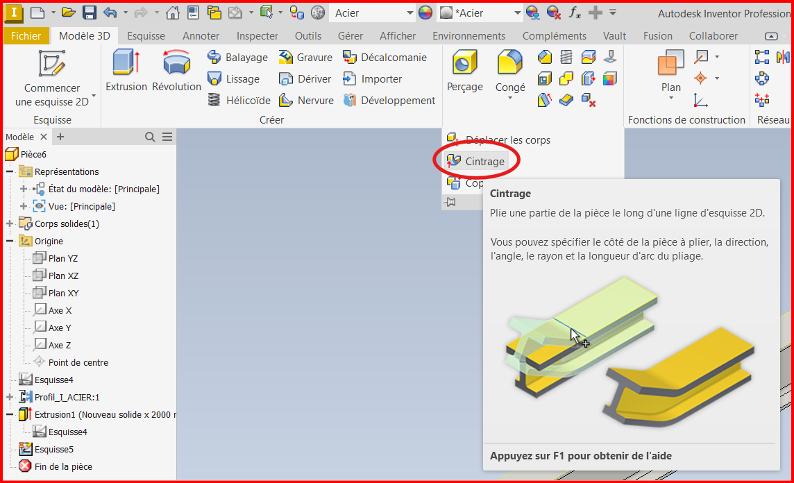 La commande Cintrage permet de plier une portion d’un corps solide autour d’une ligne définie par l’utilisateur. Pour l’utiliser efficacement, il est nécessaire de suivre plusieurs étapes :