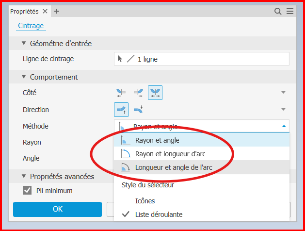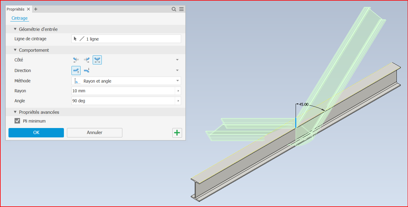 Options avancées : Il est possible de limiter le pli à certaines portions du corps via l’option Pli minimum, utile lorsque la ligne de cintrage traverse plusieurs zones.