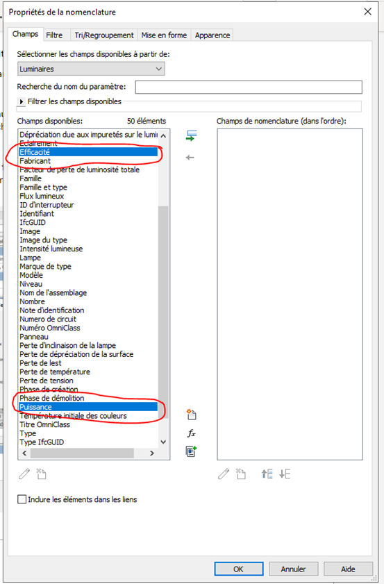 Attention, dans une nomenclature de luminaires, vous ne pourrez pas créer la colonne “Intensité Initiale” : ce champ n’est pas disponible dans la liste....