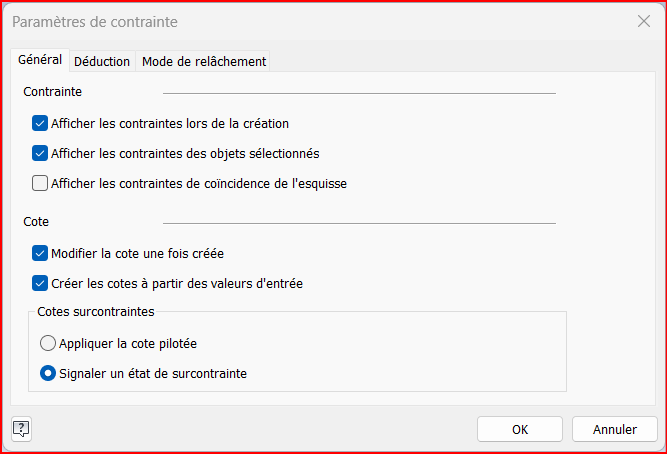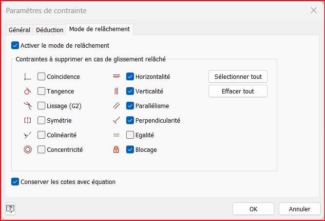 Le mode de relâchement intervient lorsqu’une esquisse est sur-contrainte ou qu’une modification géométrique devient incompatible avec les contraintes existantes. Cela peut bloquer ou déformer excessivement le profil.