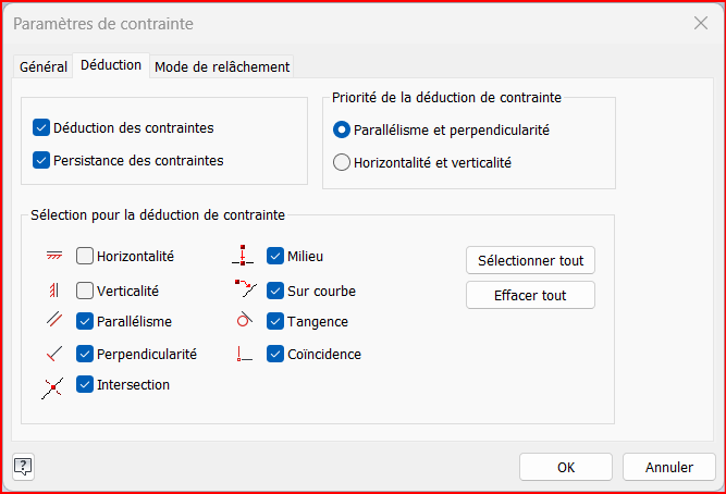 Les contraintes de déduction (ou contraintes automatiques) sont générées au fil du dessin en fonction de la position du curseur par rapport aux entités existantes. Par exemple, on pourra forcer automatiquement une verticalité, une perpendicularité ou une tangence.