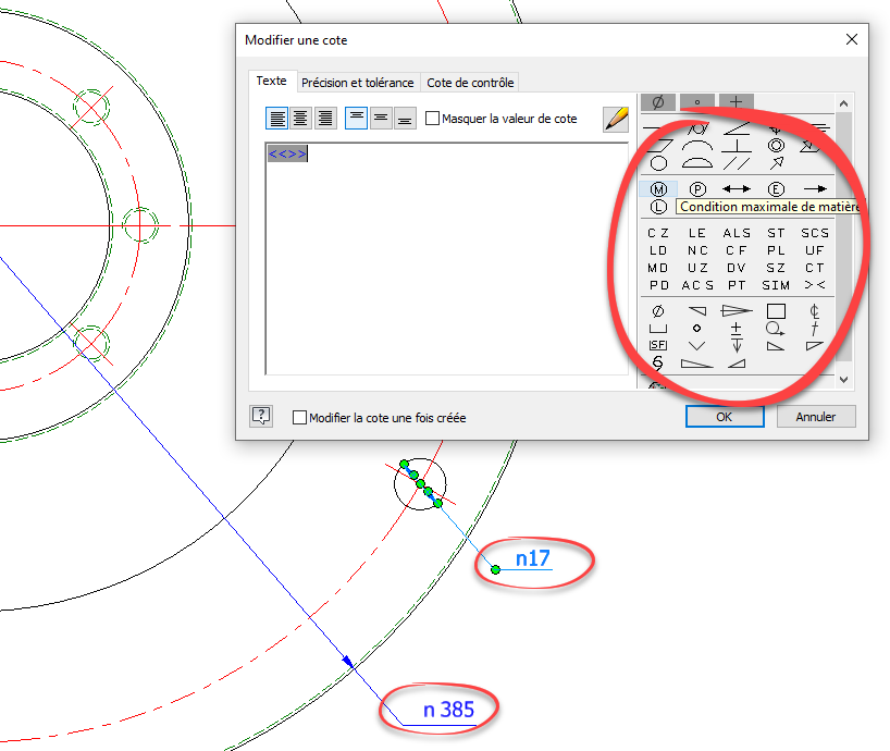 Exemple : après l'insertion d'un symbole de diamètre (cotation de cercle, perçage etc.), la lettre n s'affiche à la place du symbole de diamètre Ø.