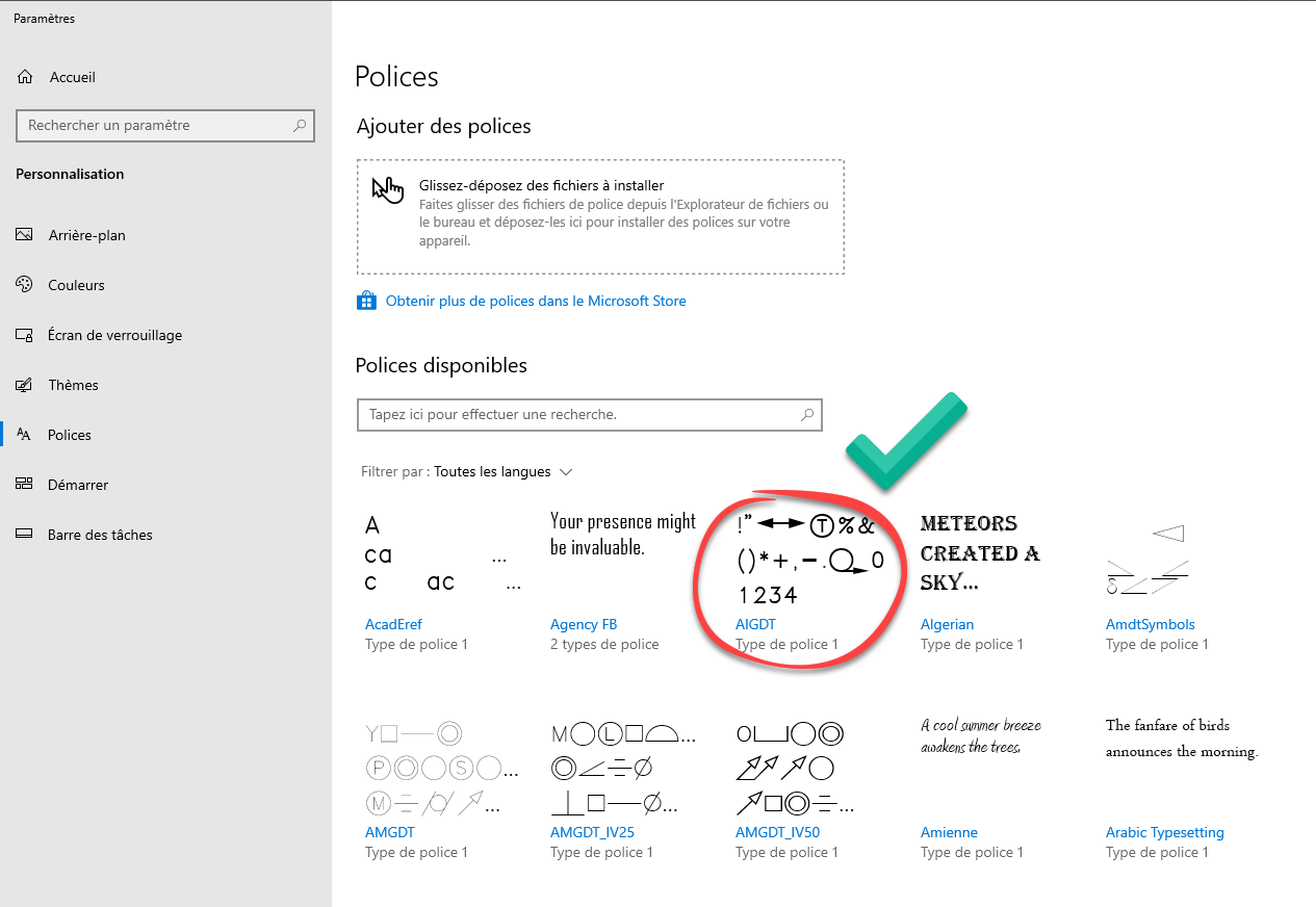 - Téléchargez la police AIGDT (Aigdt___.ttf - joint à cet article) et placez-la dans le dossier Polices de Microsoft Windows, qui est généralement : C:\WINDOWS\FONTS\