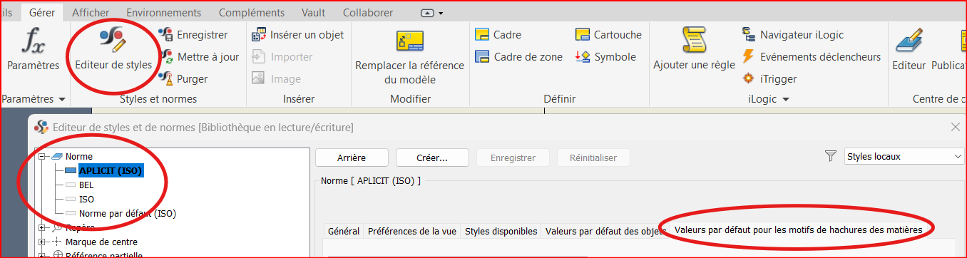 Ne pas oublier de mettre à jour les styles dans chaque gabarit IDW/DWG utilisé. Ajouter les nouveaux motifs de hachures et vérifier l’attribution correcte pour chaque matière. Cela évite d’avoir des messages de non-conformité lors de la création de nouvelles mises en plan.