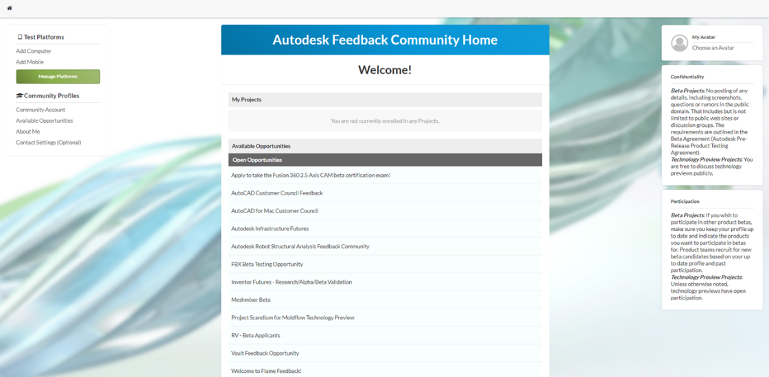 Puis, il faudra demander un accès à cette version dans la partie Available Opportunities. Si vous l’avez déjà, le lien apparaît dans My Projects.