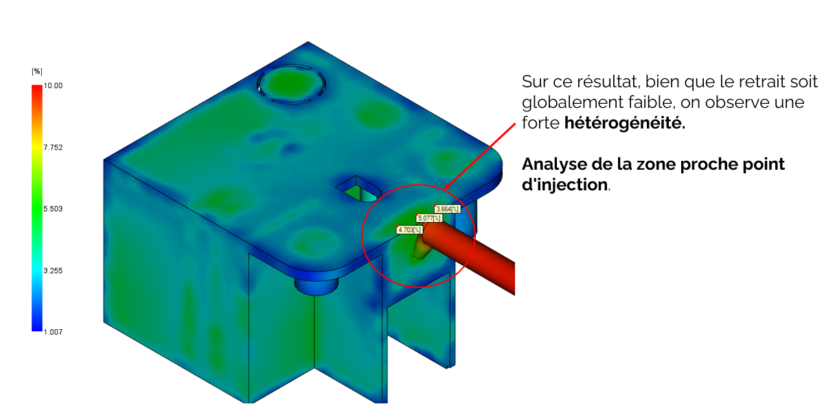 - Homogénéité : L'objectif n'est pas seulement d'obtenir des valeurs basses, mais d'observer le retrait le plus homogène possible sur l'ensemble de la pièce. Un gradient de retrait trop important entre deux zones est le principal vecteur de gauchissement et de tensions internes résiduelles.