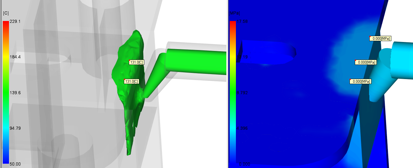 L'observation simultanée de la veine fluide (en vert sur l'image de droite) et de la pression de cavité (image de gauche) révèle une anomalie critique : la pression chute à zéro alors que la matière n'est pas encore solidifiée, notamment au niveau du seuil et du point d'injection.